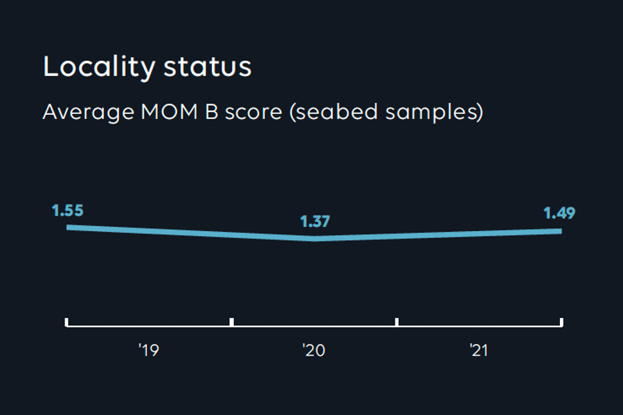 On the basis of these investigations, the individual location receives a score, which also provides an indication of when the next MOM-B investigation should be carried out. A poor score often requires more frequent seabed investigations than a good score. In addition to MOM-B, analyses are also conducted locally at individual facilities. These include measurement of density, oxygen level in the sea, currents, water quality, visibility, dives etc.