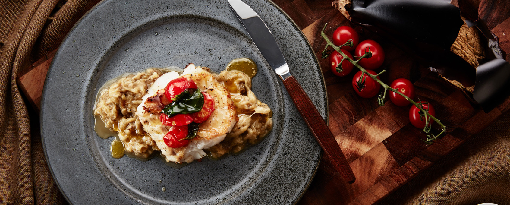 5. Serve the fried fish on top of the aubergine compote and topped with the basil butter and tomatoes.