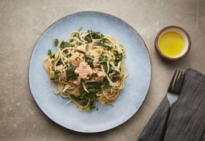 This fresh dish with salmon and pasta as well as spring onions and leaf parsley can be enjoyed hot or cold. The salad is perfect for dinner, lunch or the lunch box.