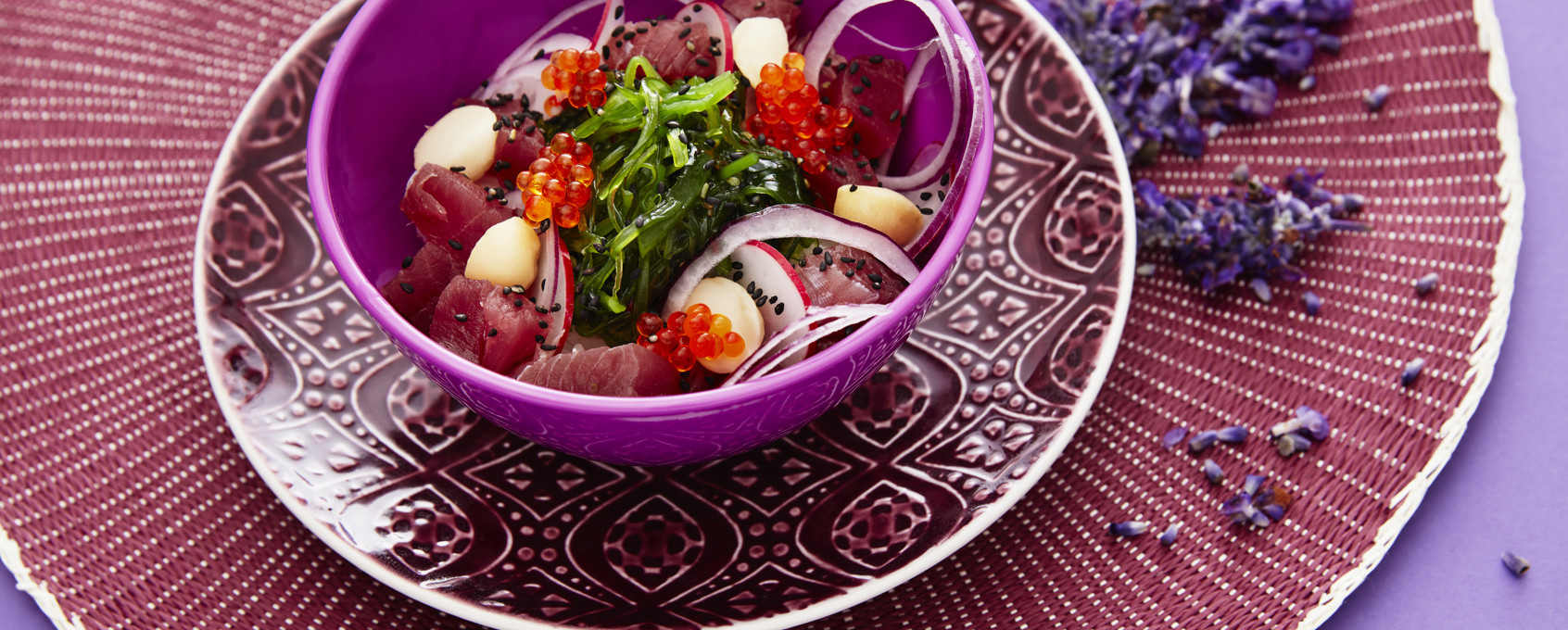 - Serve out the rice in serving bowls then add the vegetables and fish. Top with the trout caviar and Poké sauce.