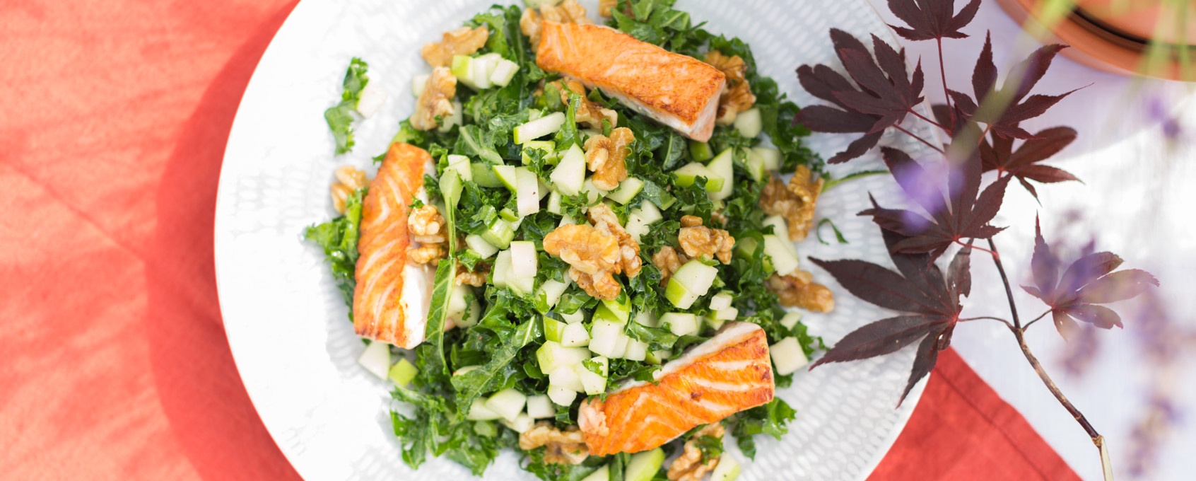 - Mix the kale, walnut kernels and apples and add the juice from half a lemon. Add salt, black pepper and olive oil. Mix the salad well and leave for 20 minutes.