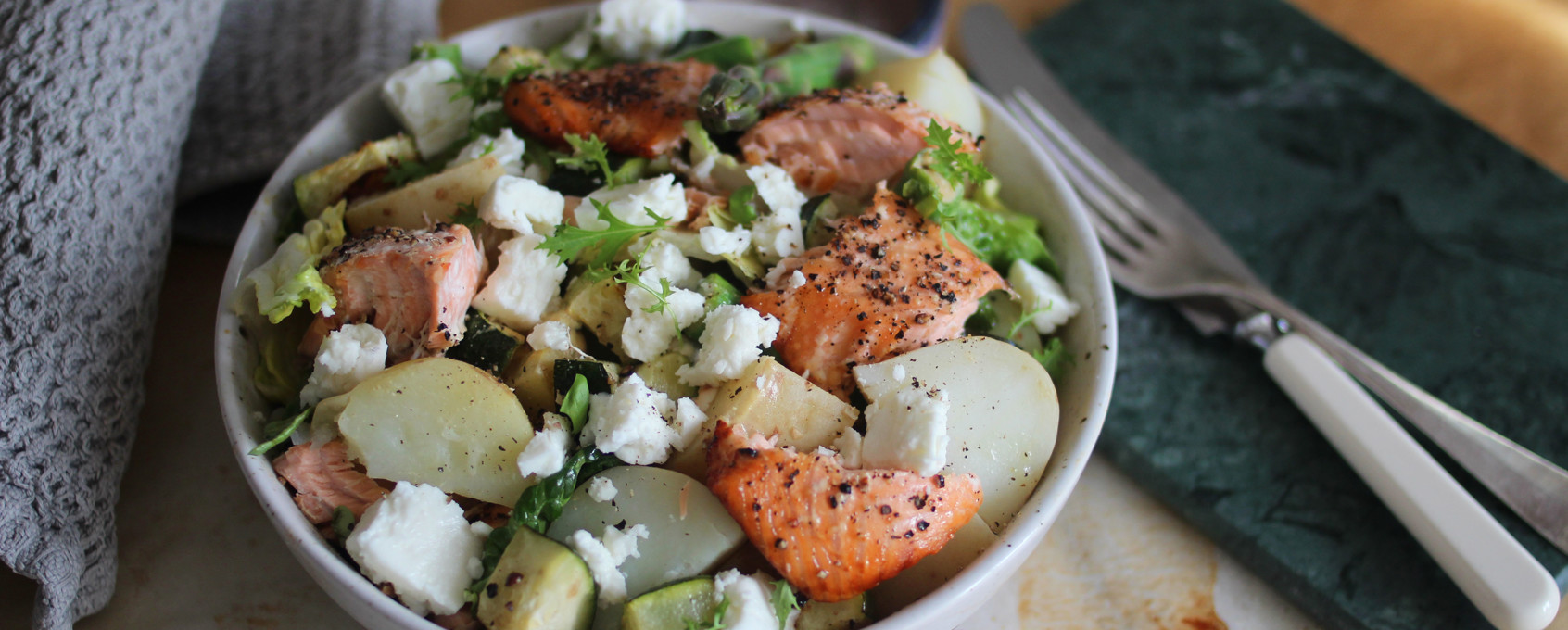 7. Tear up the little gems and spread over a large plate or in a bowl, then toss in the potato, asparagus, courgette and dressing. Top with the pieces of salmon and crumbled feta cheese.