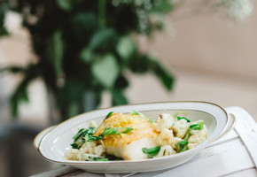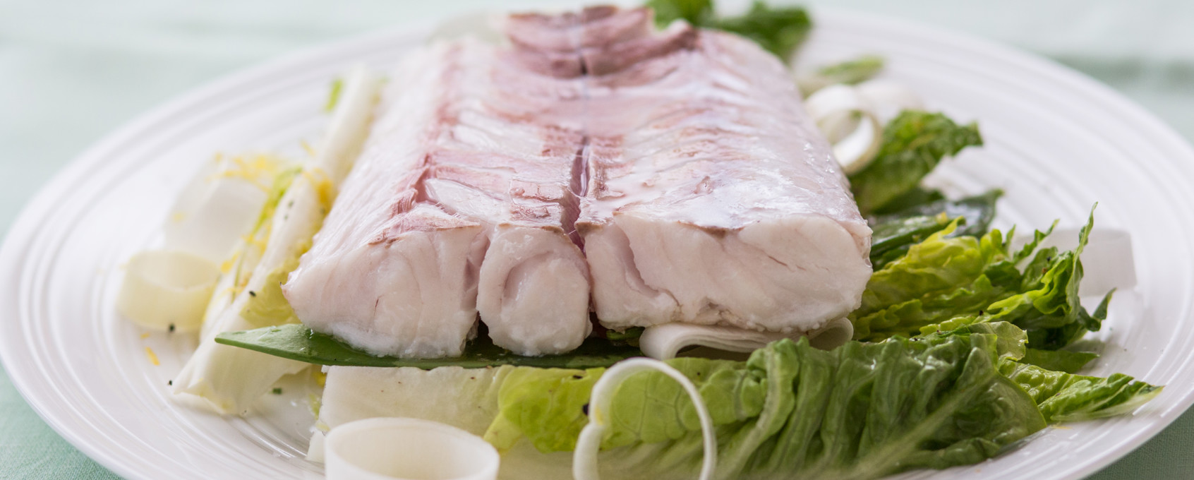 - Når lysingen er ferdig bakt, børst saltet av og legg fisken med skinnsiden opp på tallerkenen. Trekk av skinnet og server.