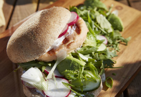 5. Smør burgerbrødene med chilimajones, og ha over spinatmiksen. Legg på fiskeburgeren, og server med couscous på siden.