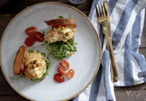 4. Stivpisk eggehvitene og ha plommen inn i gratengen før du forsiktig vender inn eggehviten. Hell gratengen forsiktig over i en form som passer din airfryer. Strø brødraspen over gratengen. Stek gratengen på 160-165°C I 24-25 minutter.