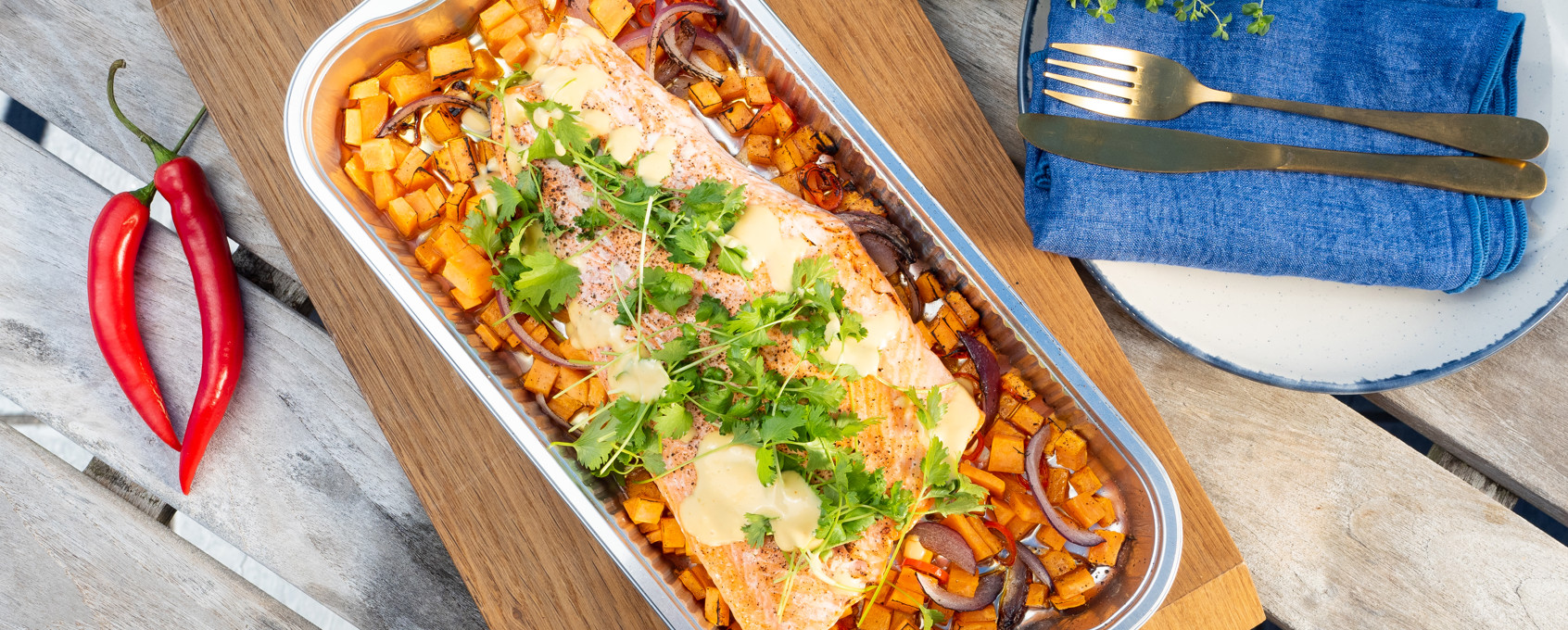 Fremgangsmåte på grillet ørret med søtpotet, chili og soyamajones: