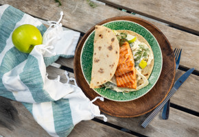 6. Når fisken er ferdig, har du den over på tallerken. Dryss over fersk koriander og server med soyamajonesen på siden.