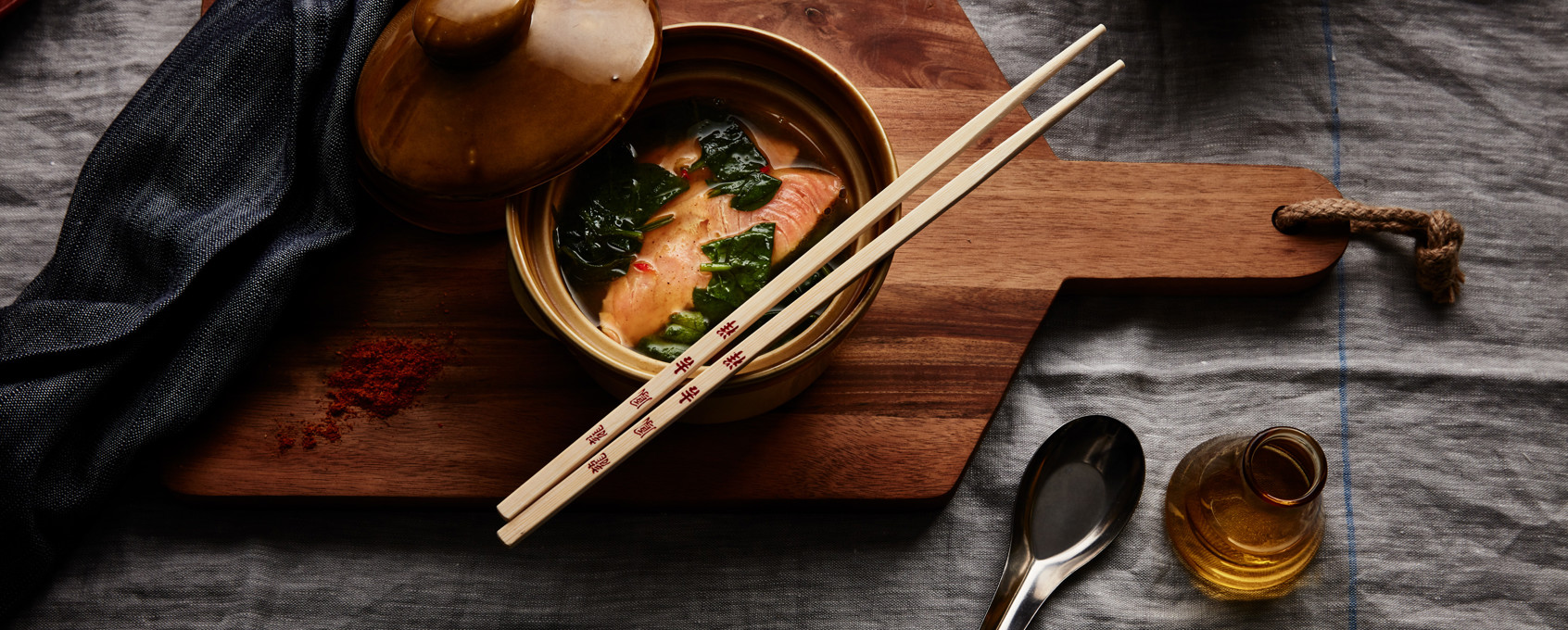 Fremgangsmåte hotpot med karri, rød chili, spinat og laks: