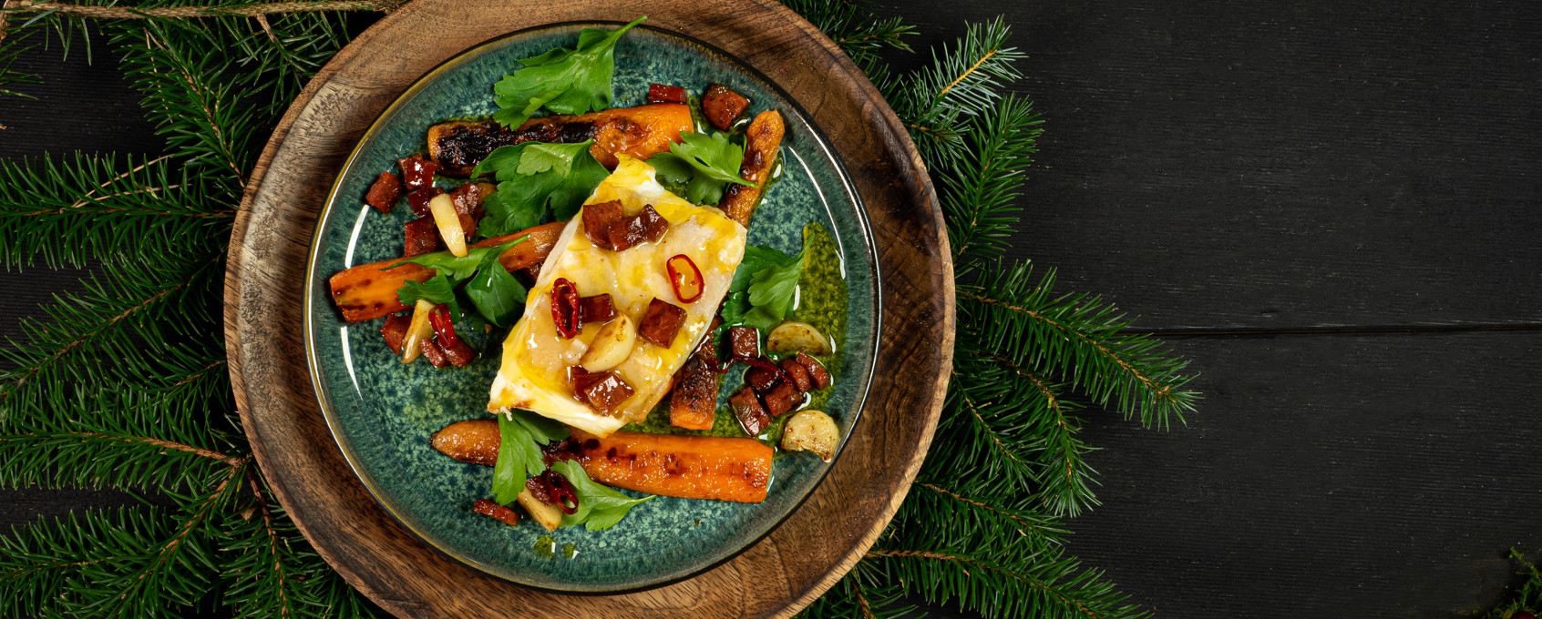 - Legg opp tallerkenen med gulrøtter i bunnen, toppet med kveitestykket og topp med bladpersille og litt mer olivenolje om ønskelig.