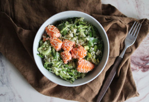 7. Server brokkolisalat med bakt laks toppet med ristede nøtter.