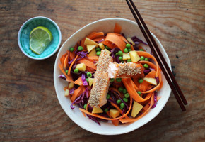 Fremgangsmåte på laks med sesamfr og nudler: