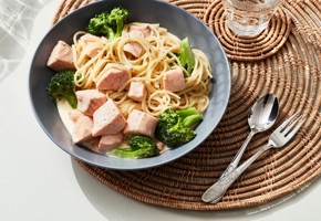 3. Hjemmelagde lakseburgere: Finhakk laks, og ha i en bolle sammen med salt og pepper. Bruk hendene eller en skje, og vend sammen til en farse. Fordel farsen i fire burgere som du former med hendene.