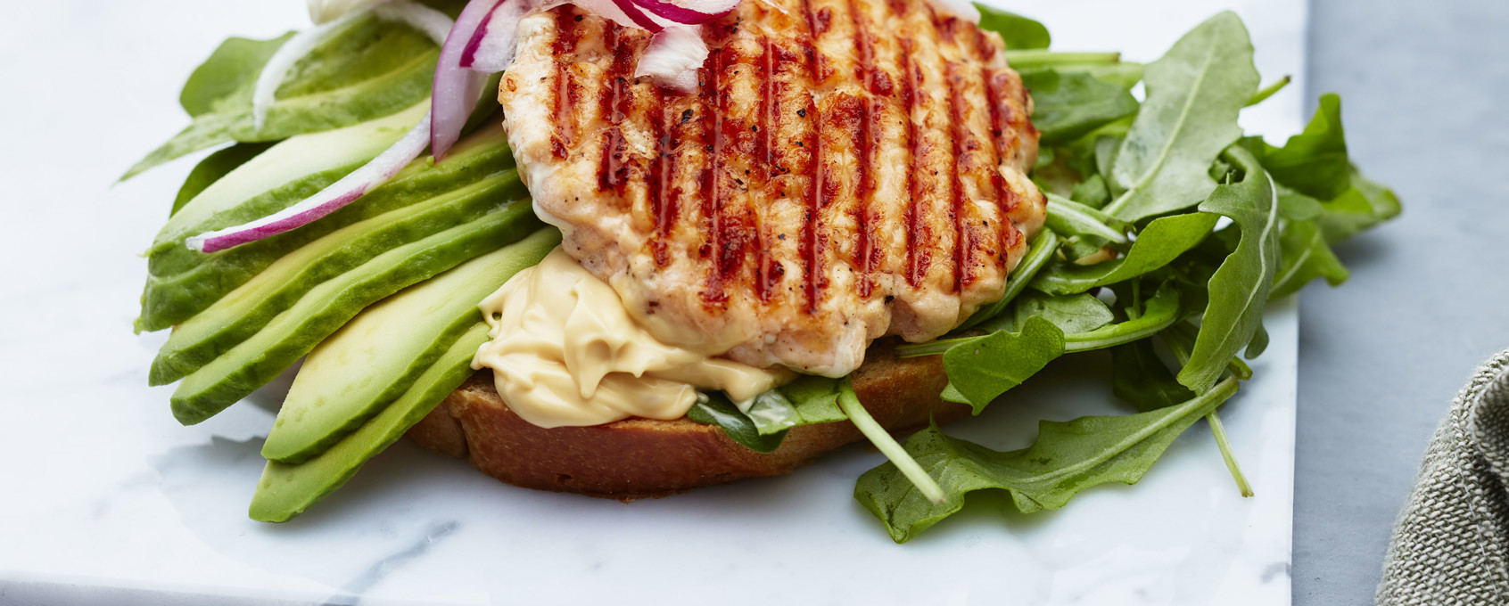 5. Server: Ha lakseburgere på briochebrød med et lag soyamajones, avokado og ruccola i bunnen, toppet med rødløk.