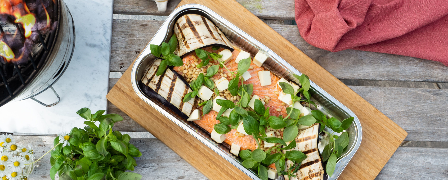 Fremgangsmåte på ørret med fetaost, pinjekjerner og grillet aubergine: