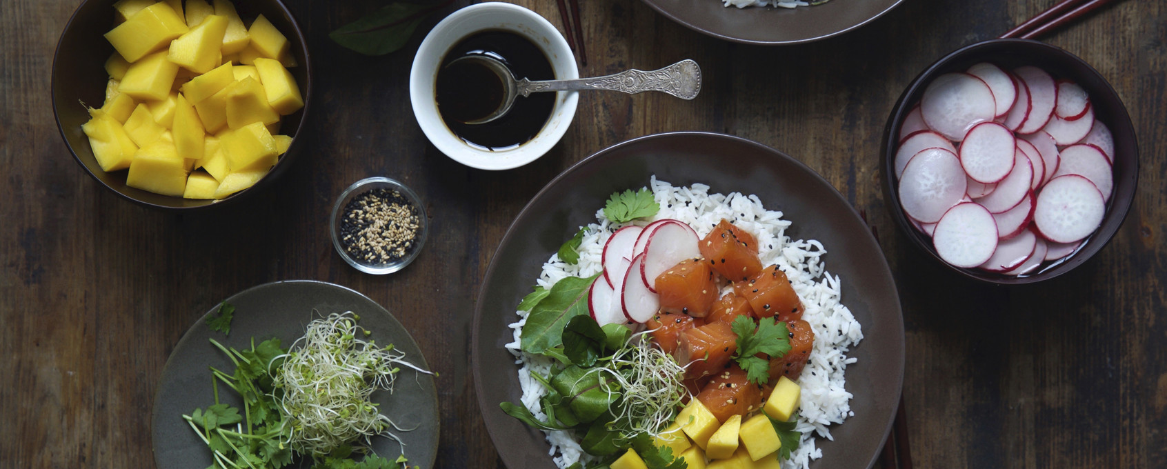 6. Dekk på med marinert laks, sushiris og skålen med mango, samt soyasaus og sriracha som tilbehør. Deretter setter alle sammen hver sin bolle etter smak og ønske.