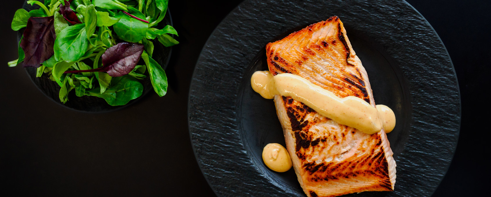 3. Laksen toppes med sausen og serveres umiddelbart sammen med salaten og soyamajones.
