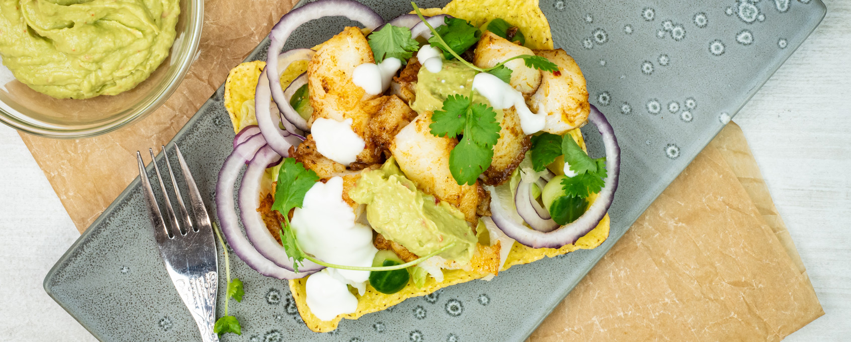 - Kutt torskestykkene i terninger og stek dem i rapsolje på middels til høy varme i en stekepanne. Tilsett tacokrydder og vend forsiktig under steking. Fisken er ferdig på cirka tre minutter.