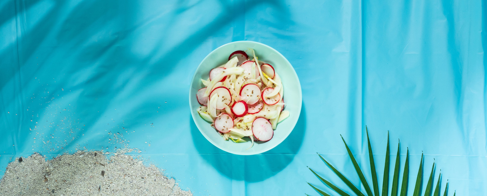 - Skär rädisorna i skivor, cirka 4 skivor per rädisa. Blanda det tillsammans anis och olivolja i fänkåls-mixen. Låt den helst stå och vila i kylskåpet någon timme innan servering.