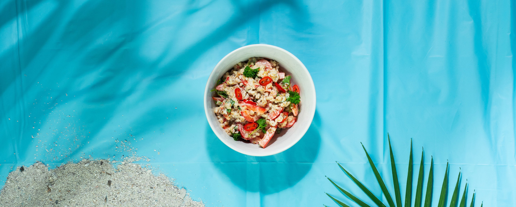 - Skär paprika i strimlor, hacka röd chili och plocka kruspersilja från varandra. Blanda ihop allt med salt och peppar.