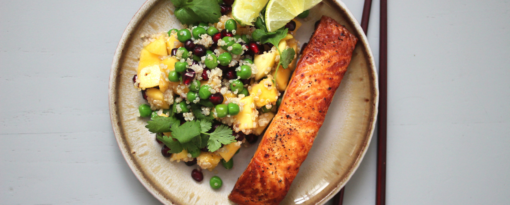 5. Dela mangon i små tärningar och blanda samman med quinoa och granatäpple tillsammans med saften från en lime.