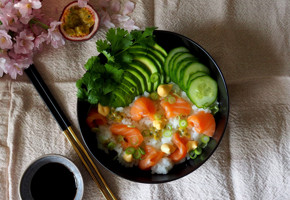 Tillagning sashimi med avokado, sallad och mangosalsa: